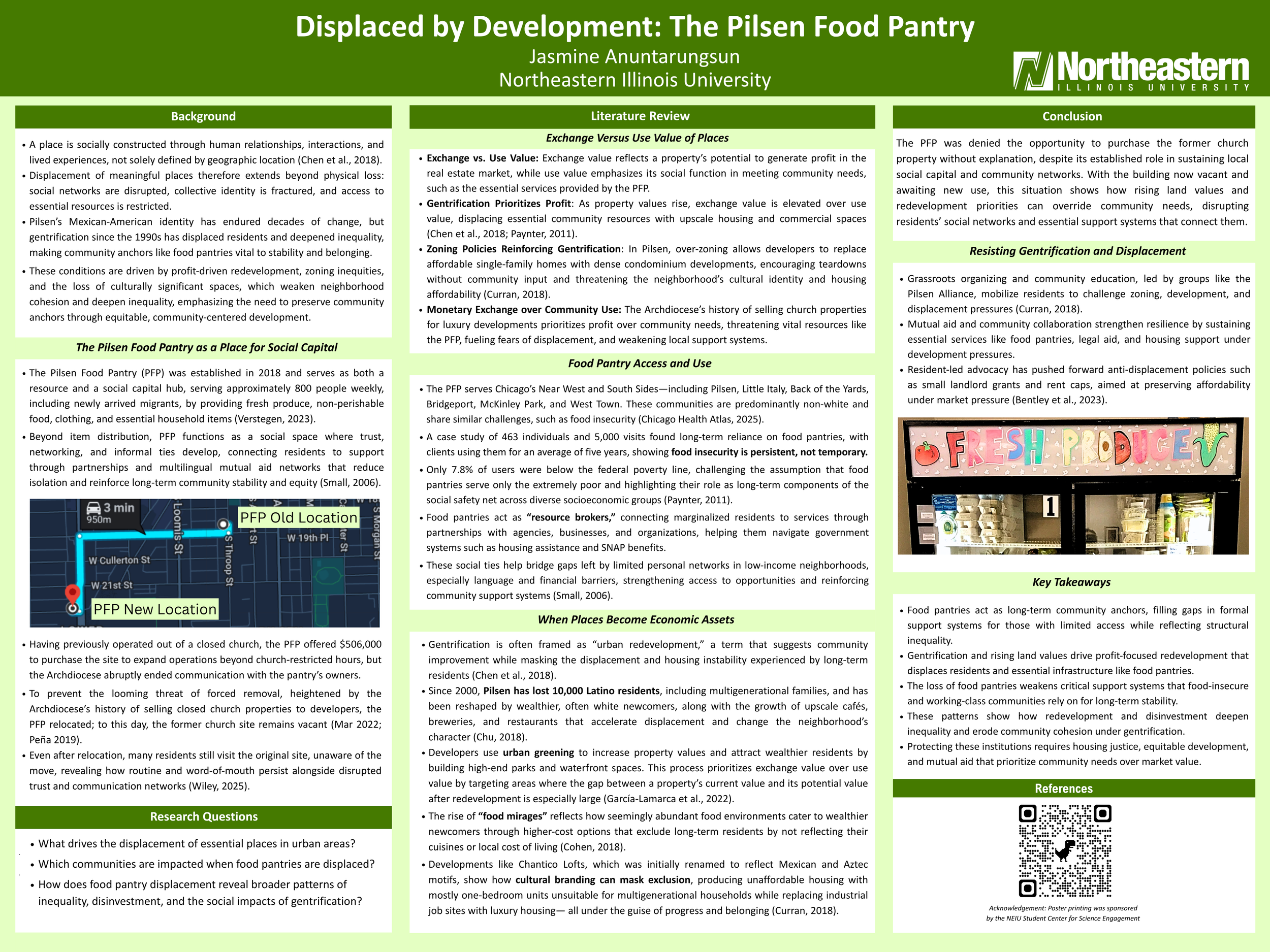 When a community loses a meaningful place, the damage goes far beyond the physical. Displacement fractures social networks, erodes shared identity, and cuts off access to vital resources. When a neighborhood park disappears, where do children play; and where do neighbors gather? A place is not just location; it is created through the people, relationships, and everyday experiences that give it meaning (Chen et al. 2018). The story of the Pilsen Food Pantry (PFP) in Chicago illustrates this clearly. Founded in 2018 in a vacant church, PFP was more than a food distribution site; it was a hub of social connection for longtime residents and newly arrived migrants. As gentrification intensified, the pantry was forced to relocate after its founders’ bid to purchase the building was rejected, prioritizing market value over community need (Chen et al., 2018; Paynter, 2011; Small, 2006). PFP’s displacement reveals how profit-driven redevelopment restricts access to essential services and weakens neighborhood cohesion. Zoning disparities and the sale of culturally significant properties further expose how structural forces push out long-standing residents while making way for wealthier newcomers, deepening inequality under the guise of progress (Curran 2018; Paynter, 2011). When community anchors like PFP are displaced, the effects ripple outward, disrupting relationships, diminishing trust, and undermining long-term resilience. Protecting these spaces requires sustained, collective action rooted in housing justice, equitable development, and mutual aid.